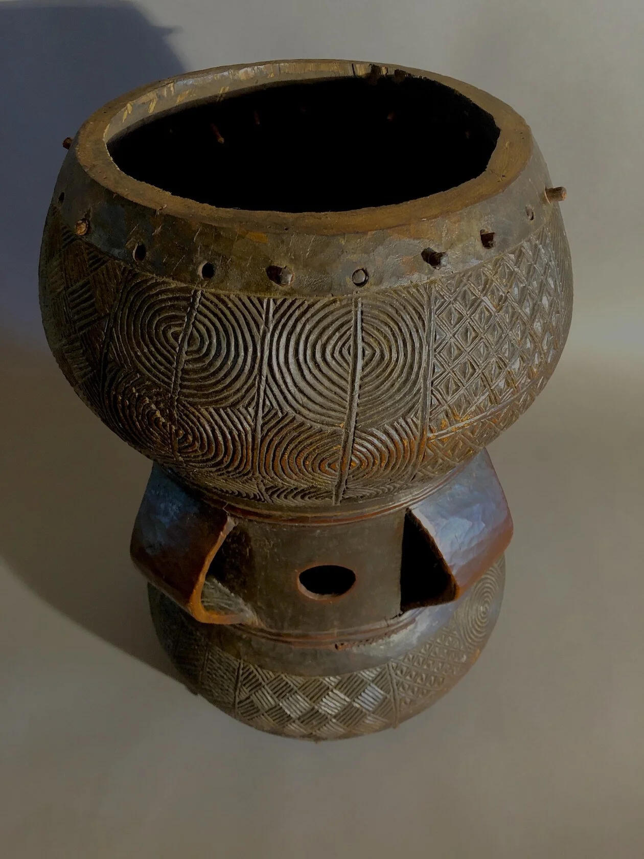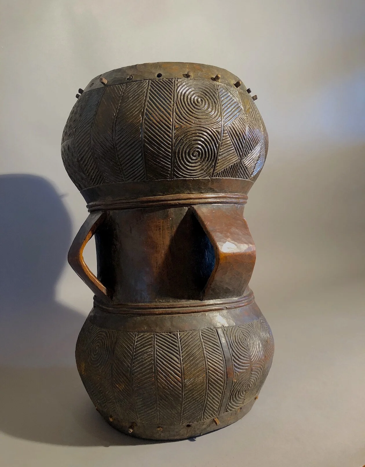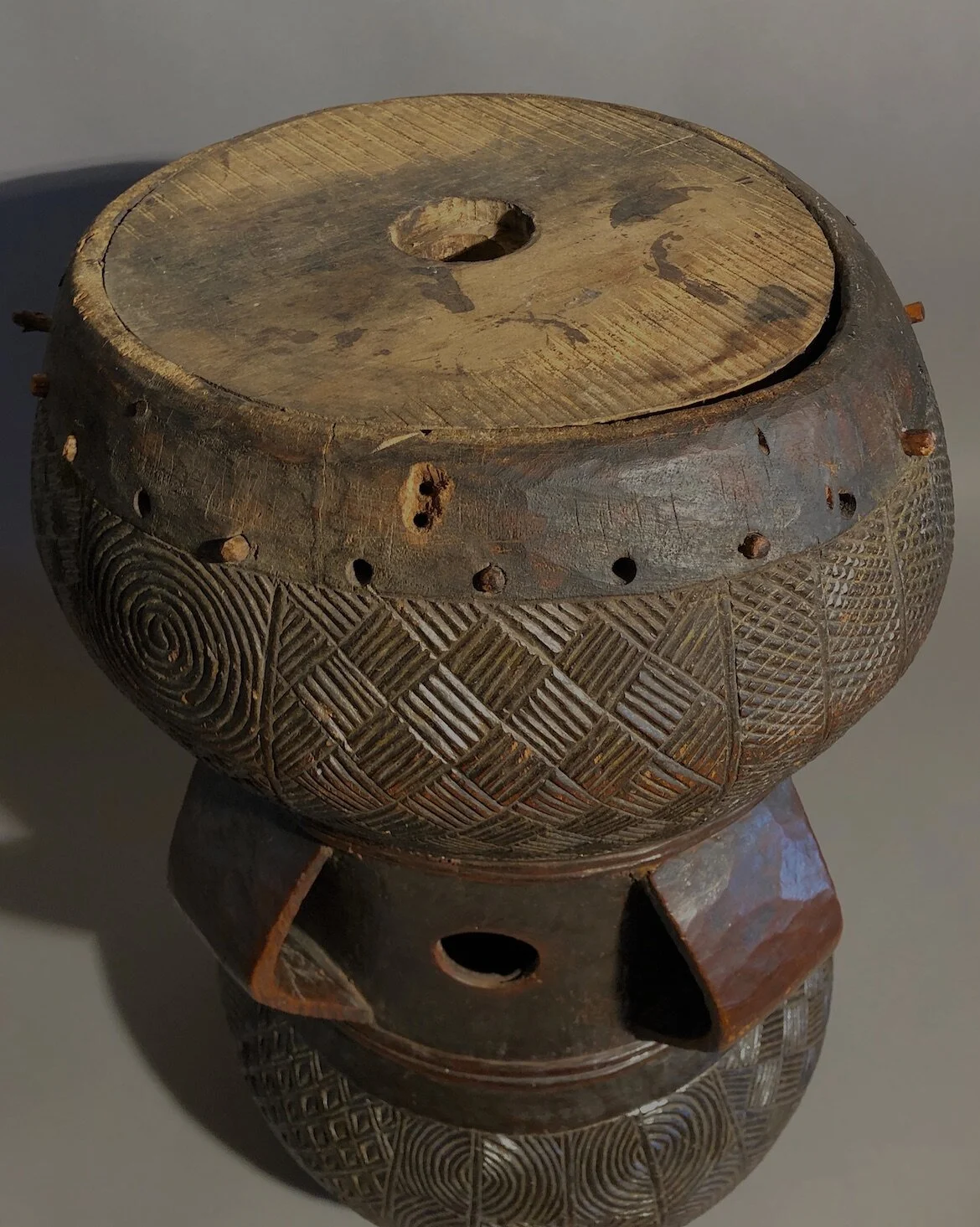 I acquired this Chokwe drum from an old London collection in the 1980s. It had been made into a lamp base as it was missing its original membranes. A beautiful object of exceptional quality.