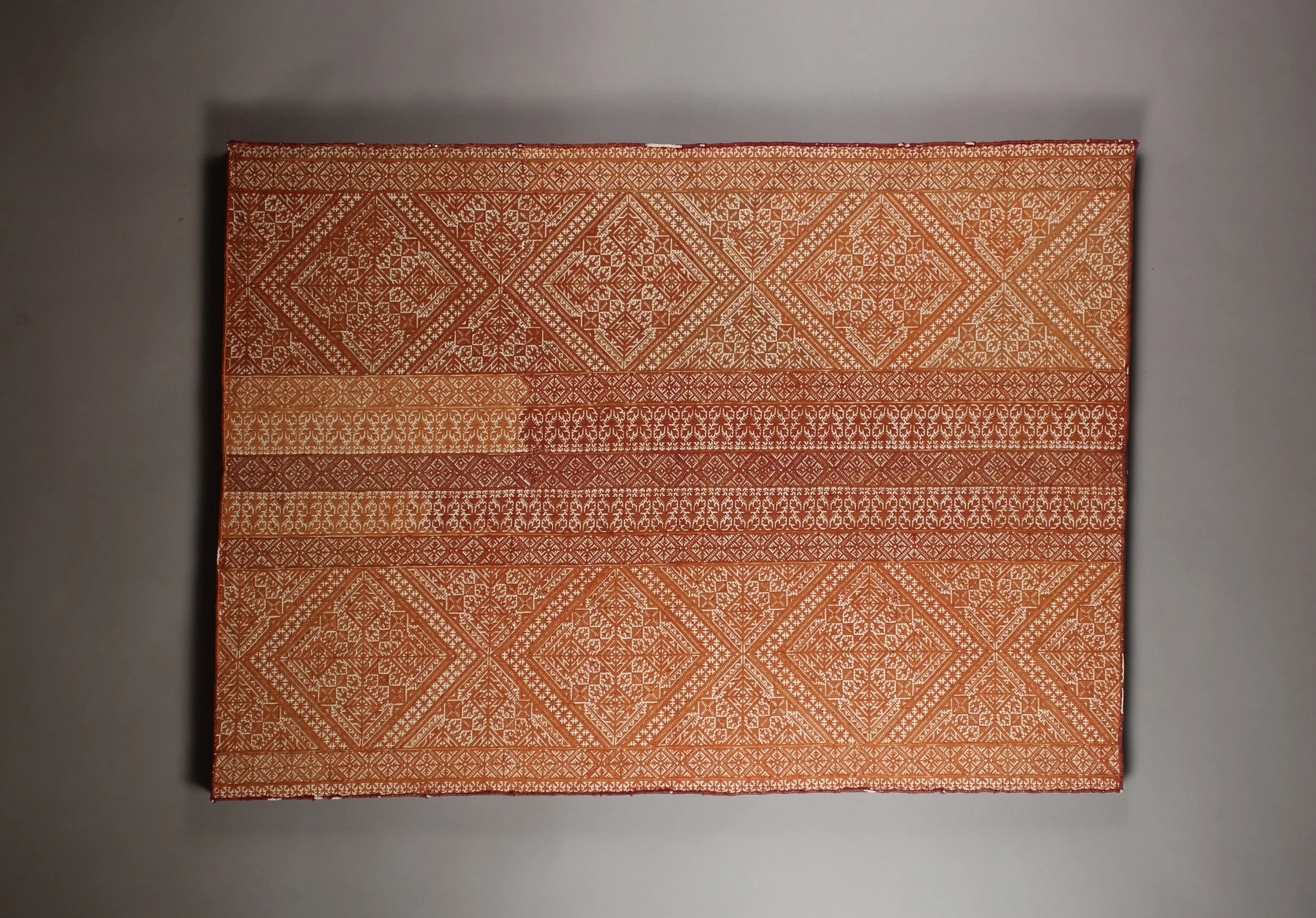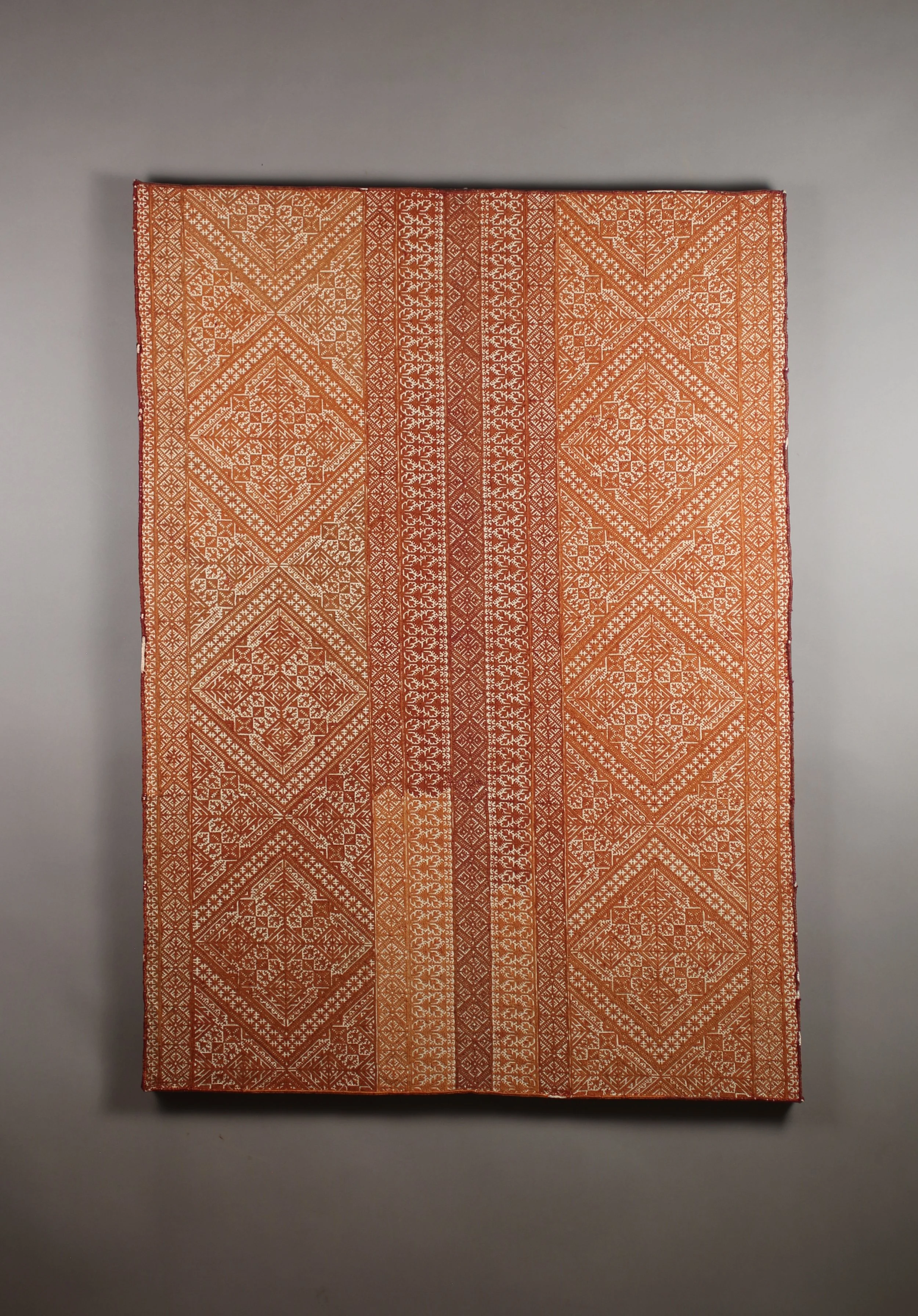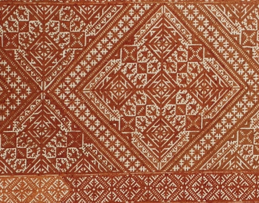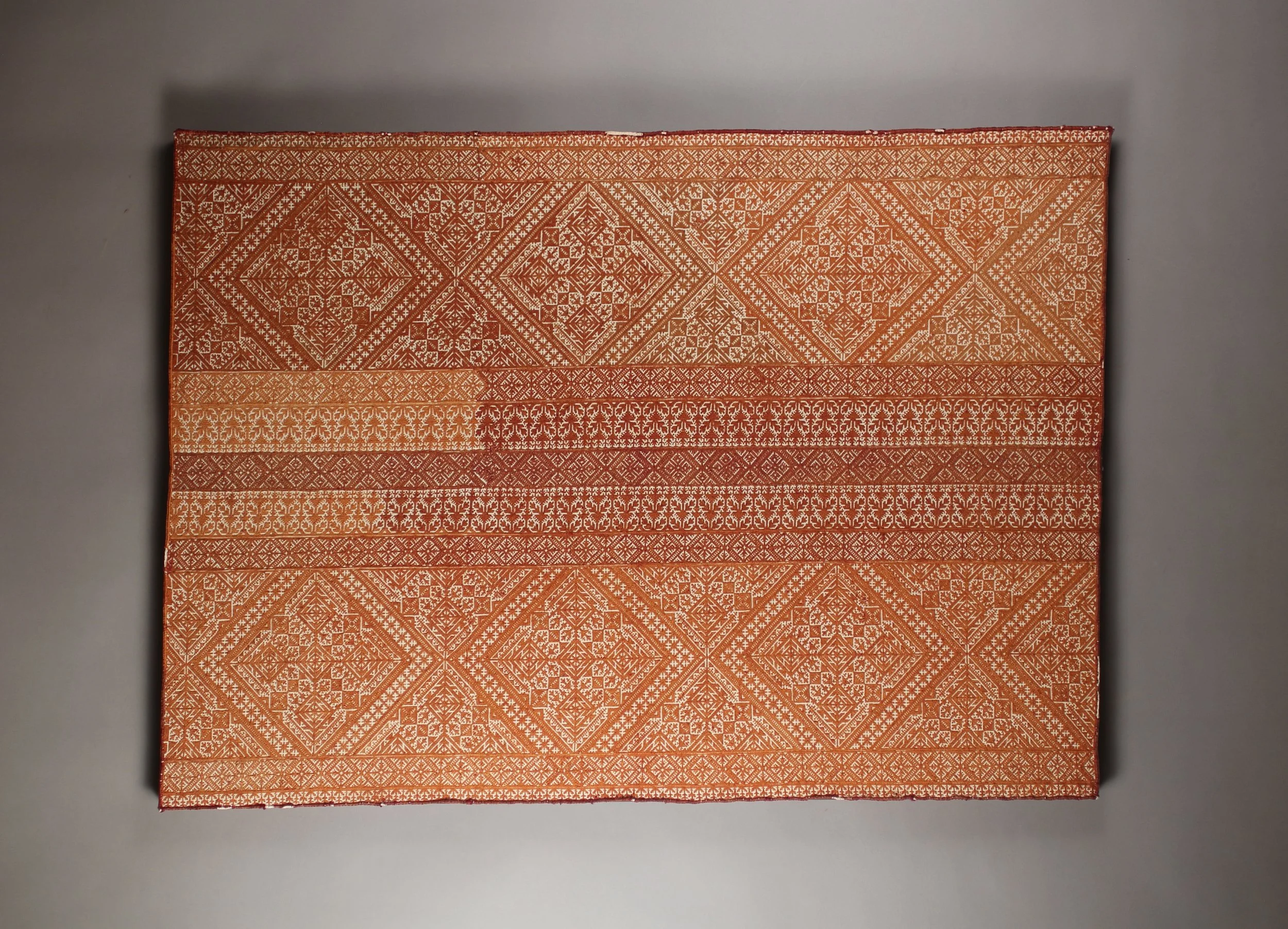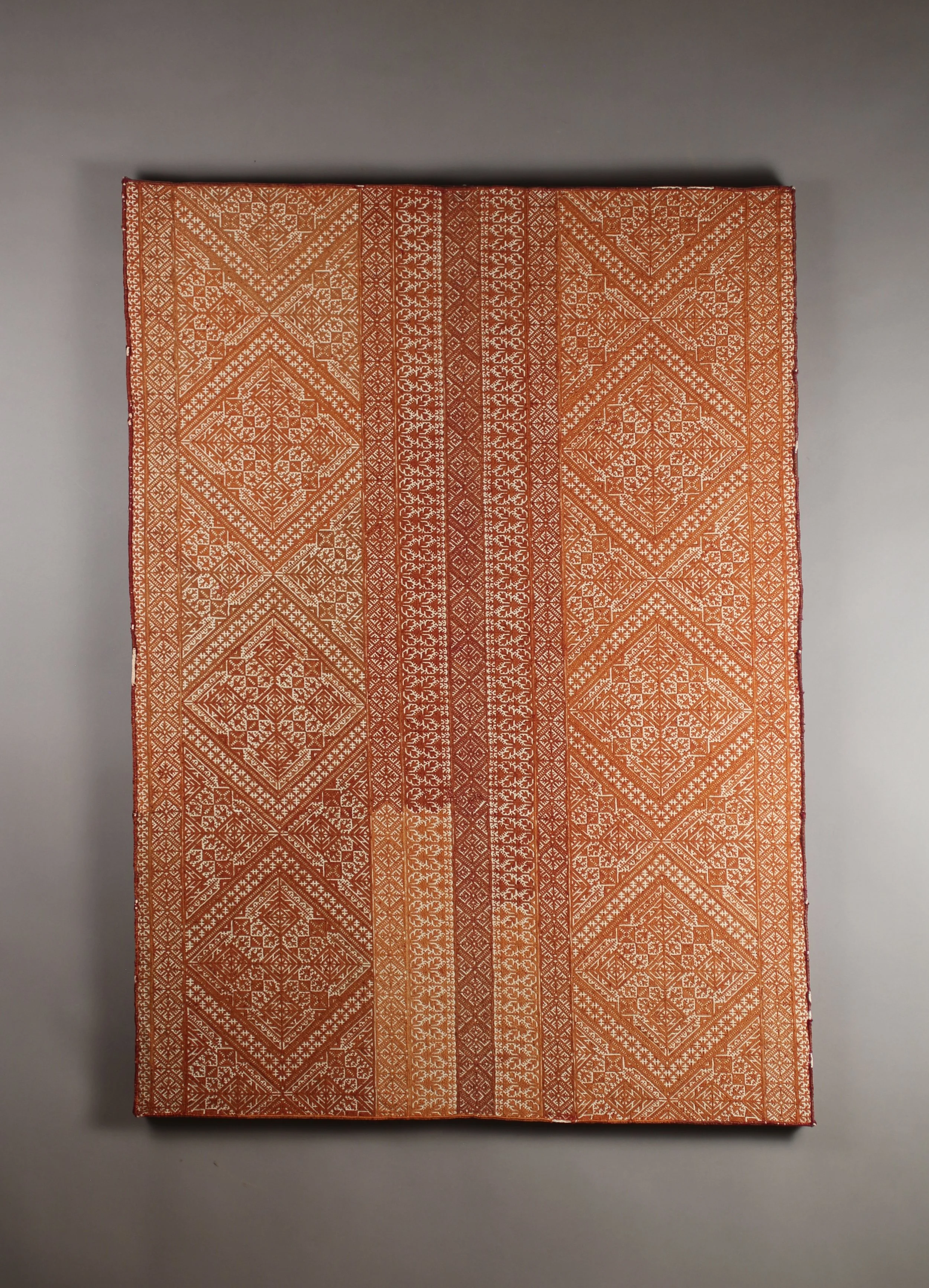 The embroidery tradition of Fez, locally known as terz d-el-ghorza, sprang into existence in 18th-century Morocco and ultimately became the preponderant form of embroidery in that country. Although invariably monochromatic, Fez embroideries appear in various colors, with geometric designs being strongly favored (Stone 1985: 28–9). This fine example has been professionally mounted on a stretcher frame and may be hung four different ways, depending on one’s fancy.