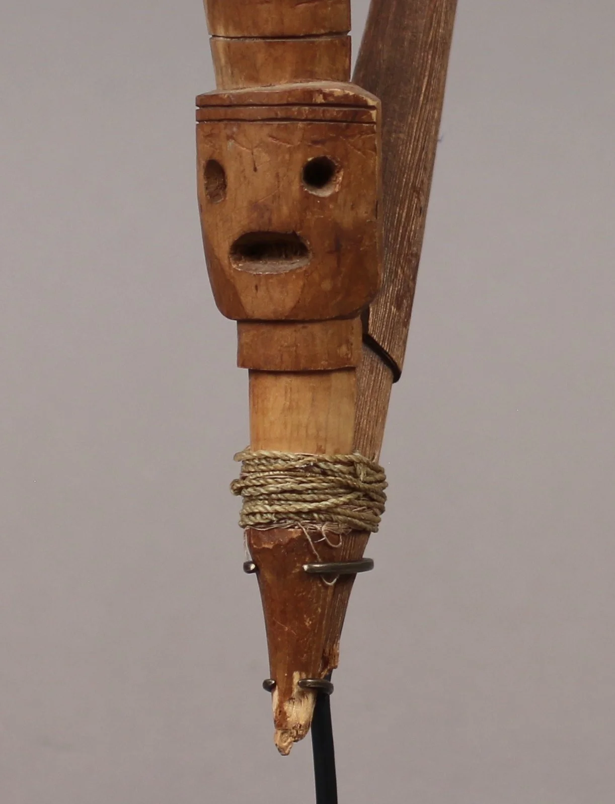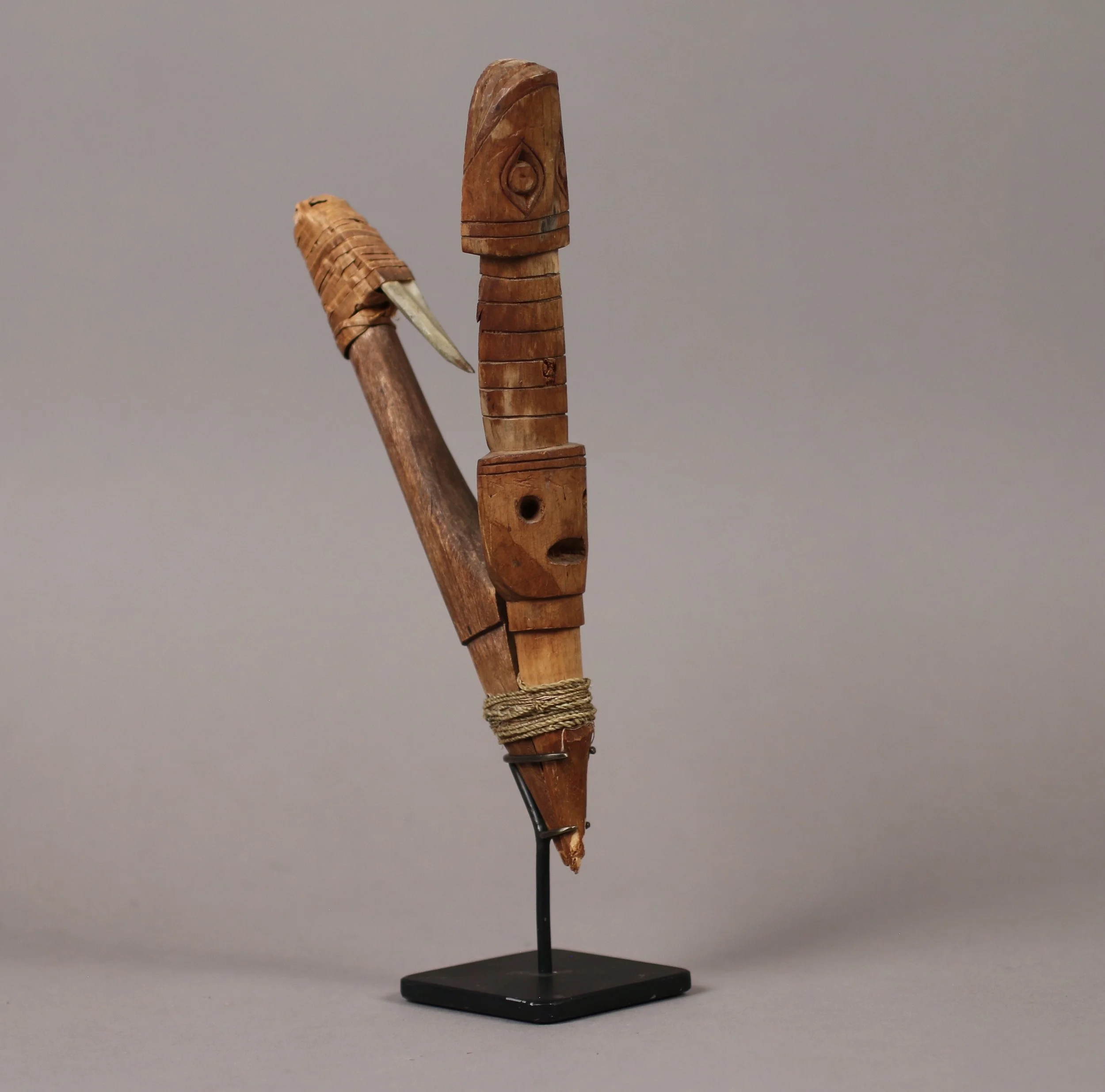 Carved wood and bone hook attached with cedar bark strips