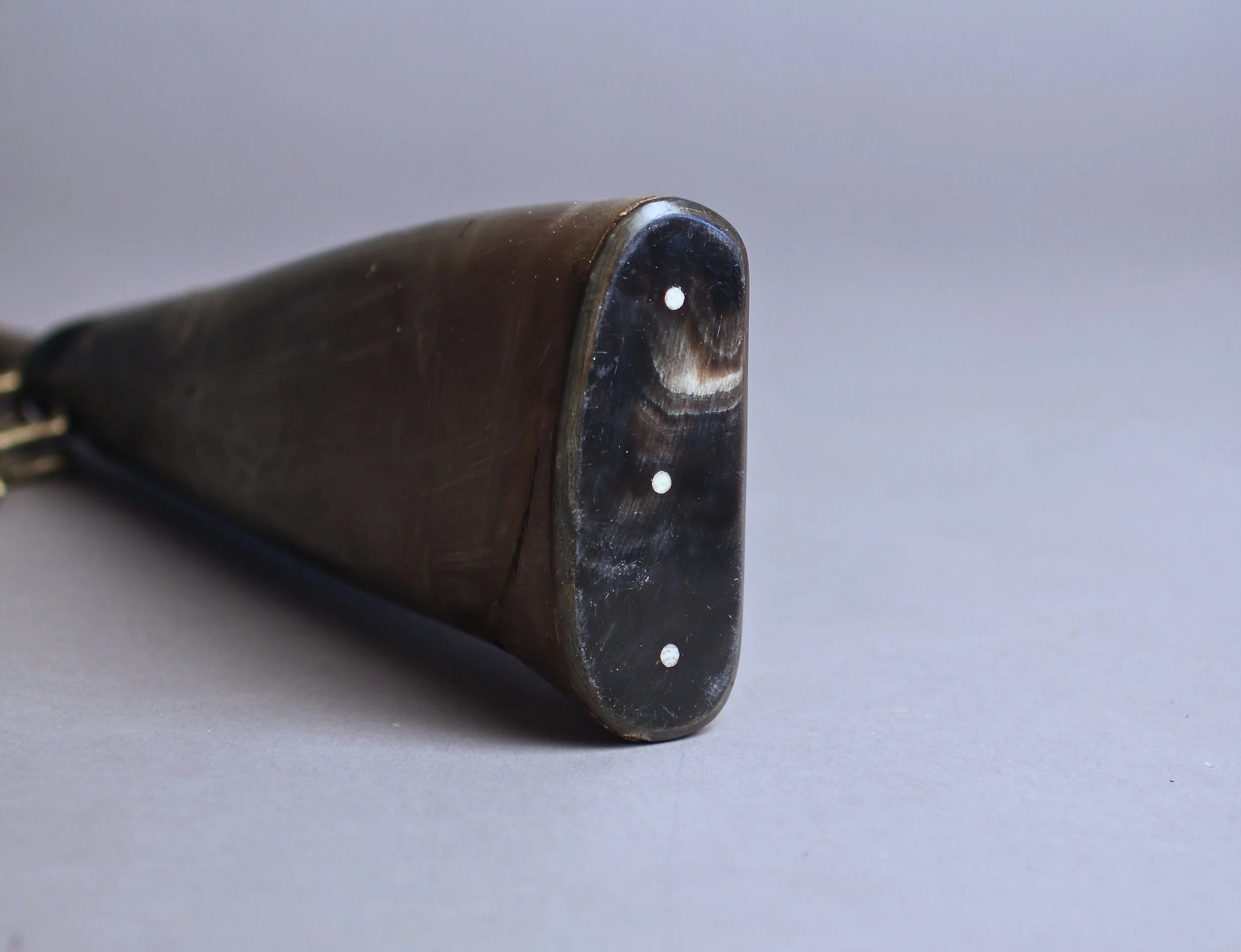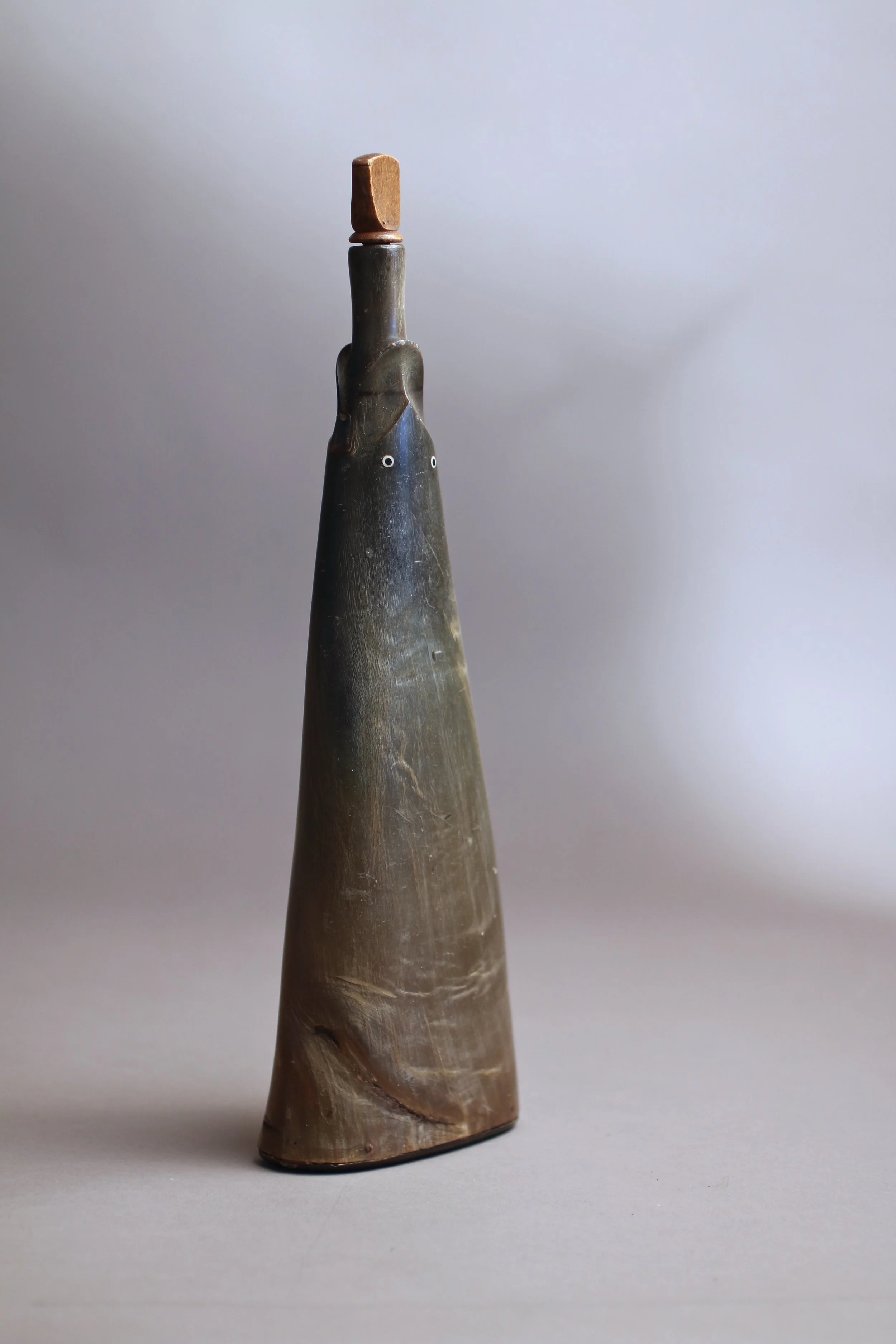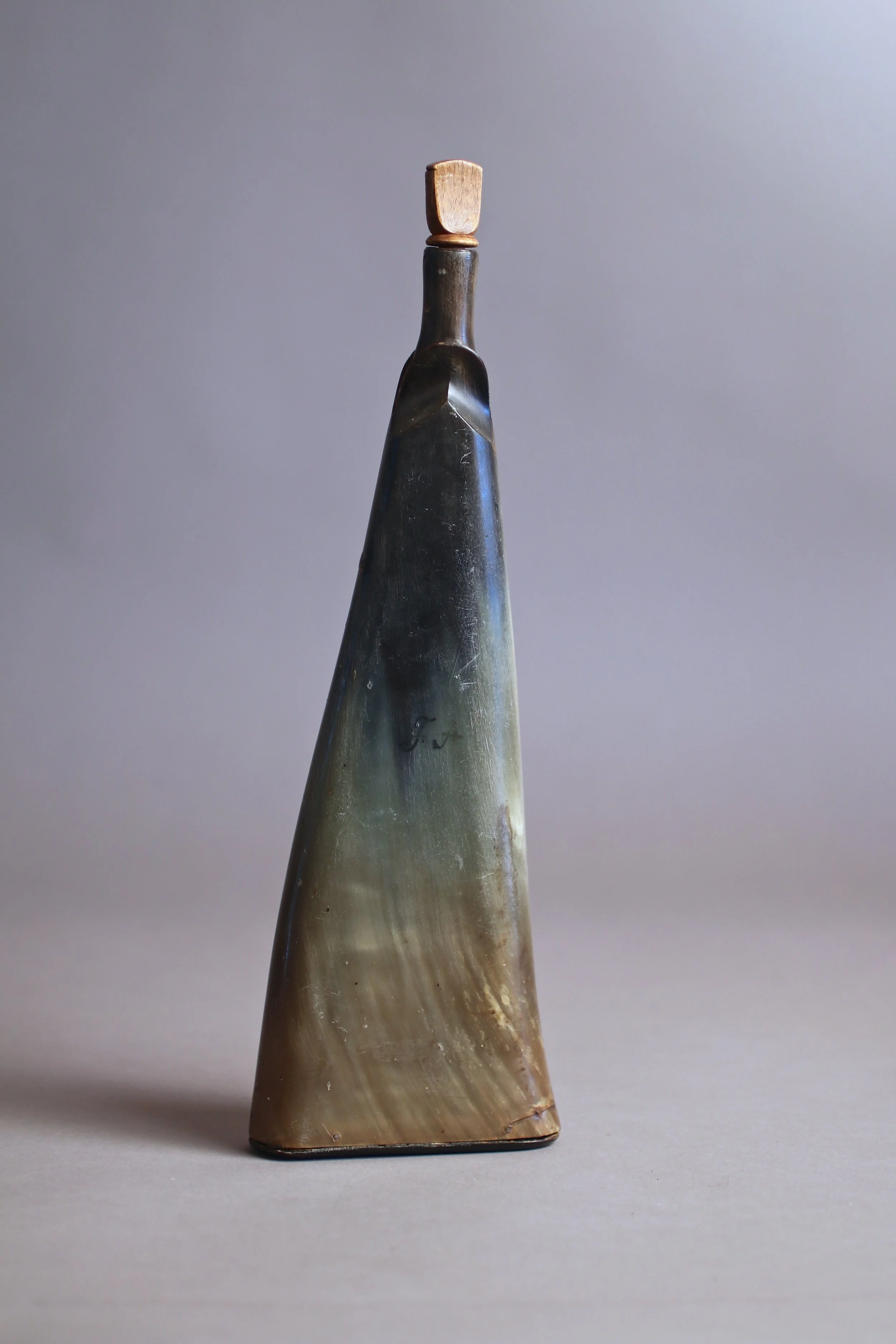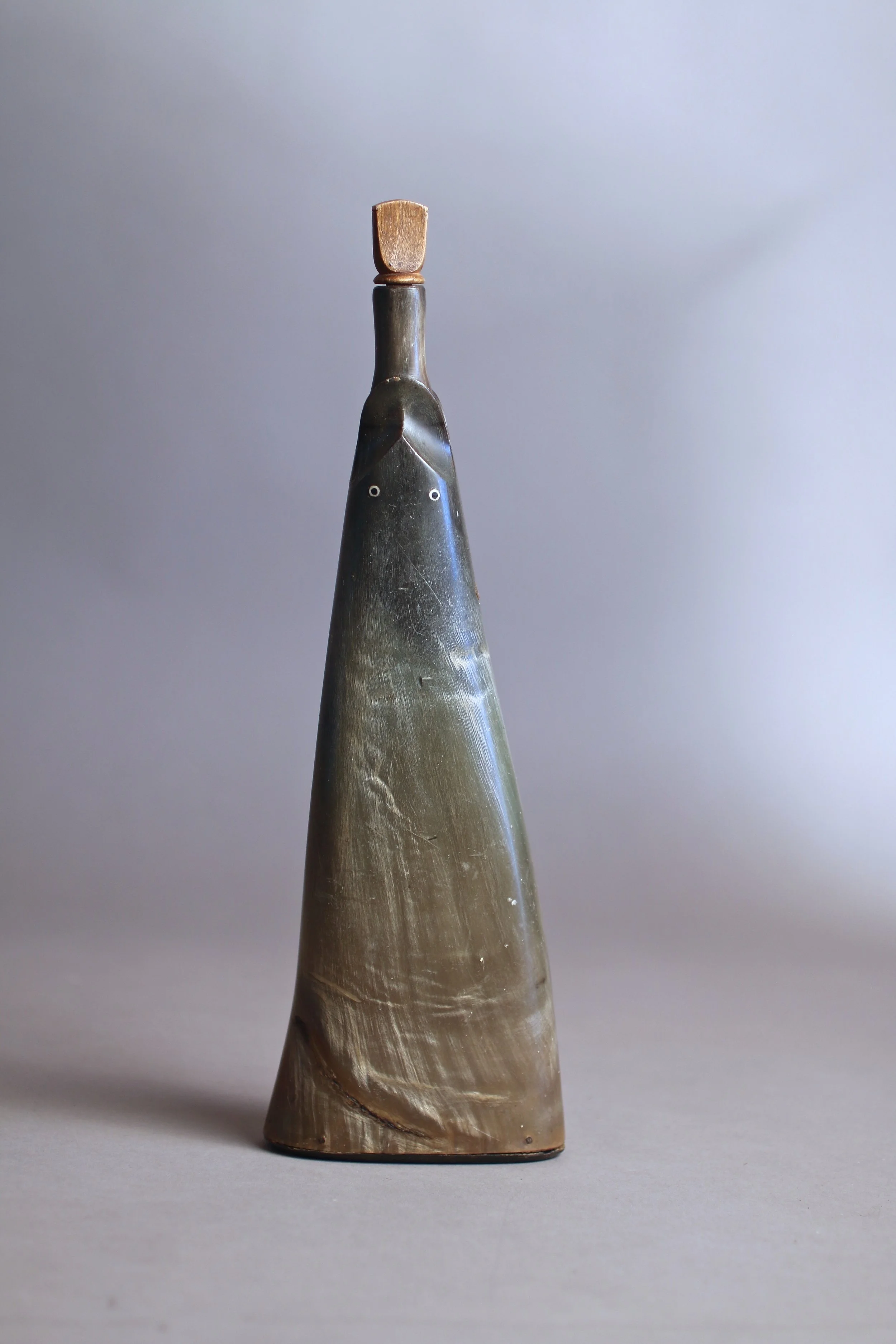 This obscure horn flask features a beautiful surface and bone-inlaid eyes that give the suggestion of zoomorphism.