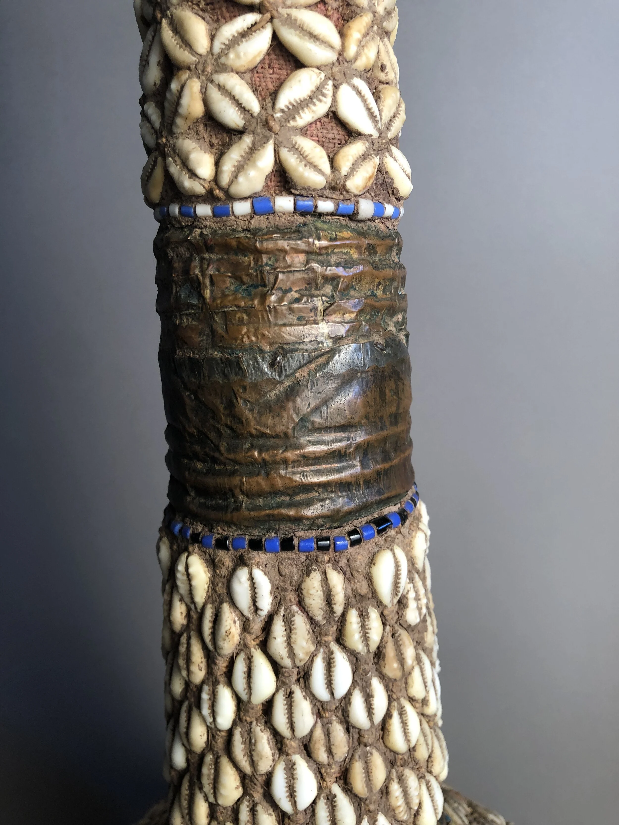 Wood vessel covered in woven raffia, copper, cowrie shells, trade beads