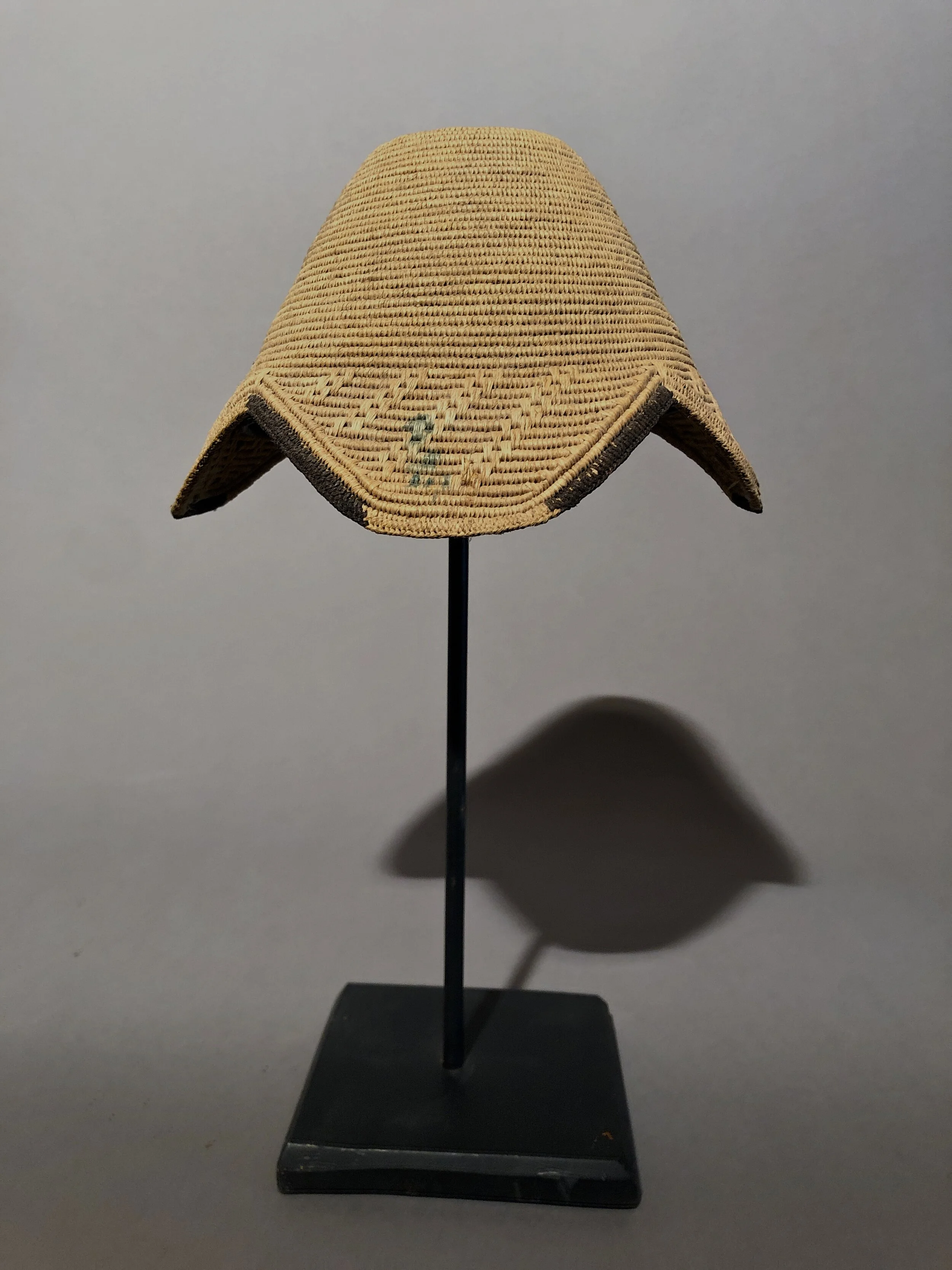 A classic woven basketry hat donned by adult Kuba males. Base not included.