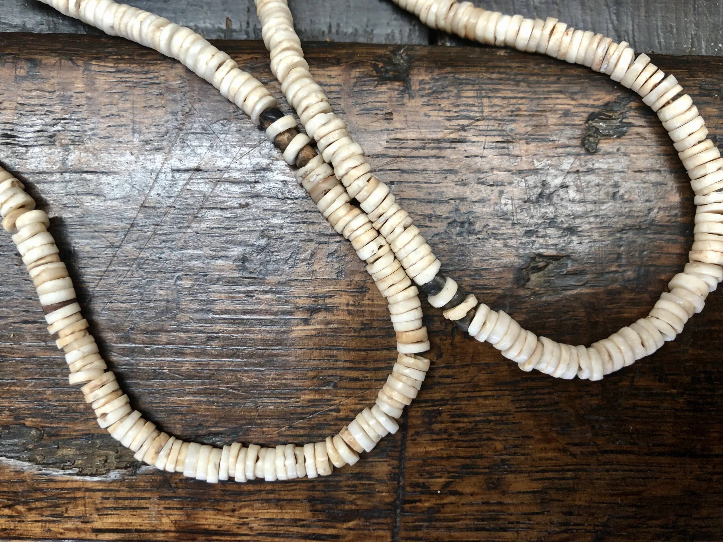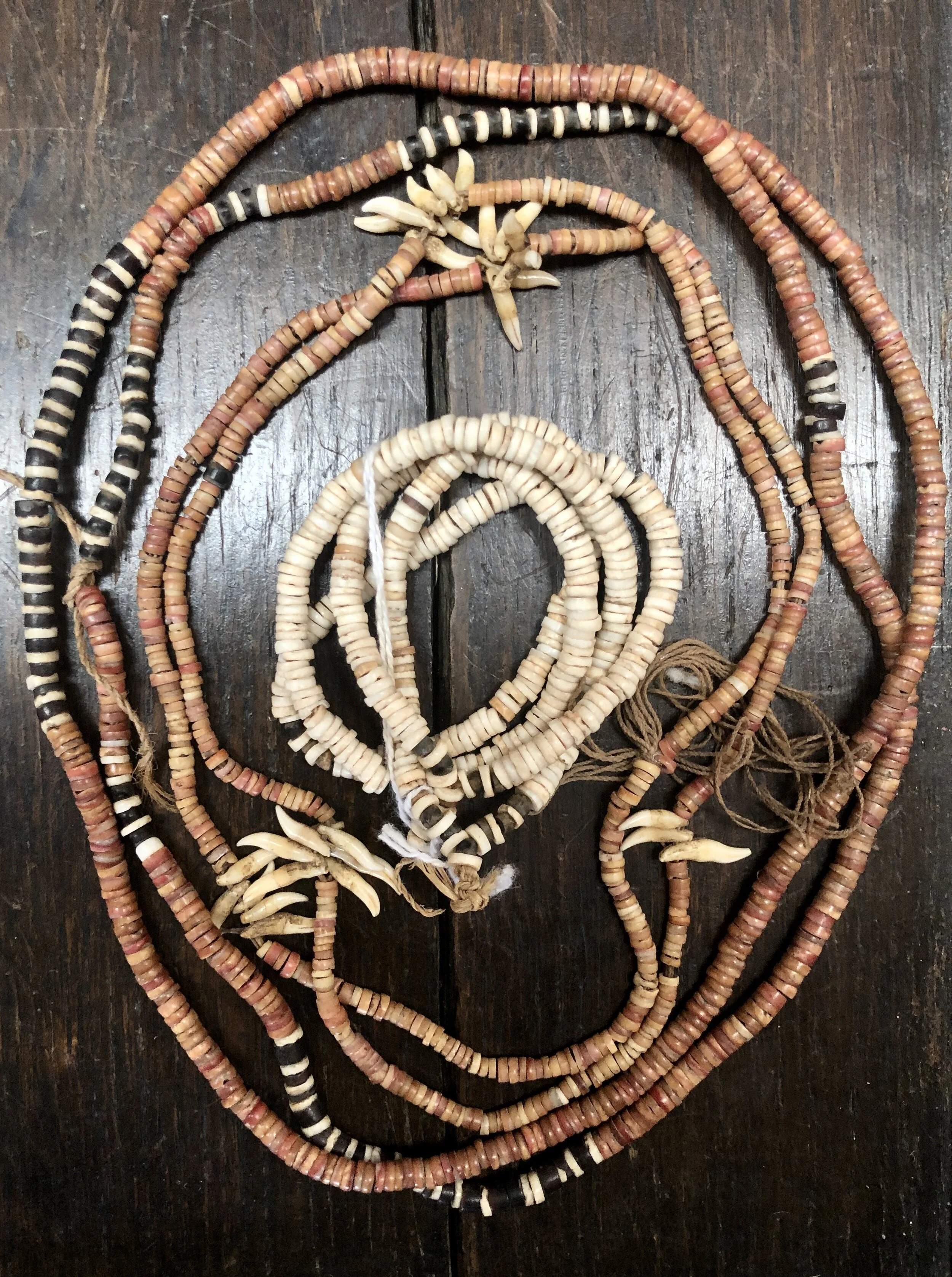 Shell beads(spondylus; clam, coconut), natural fiber; porpoise teeth (middle)