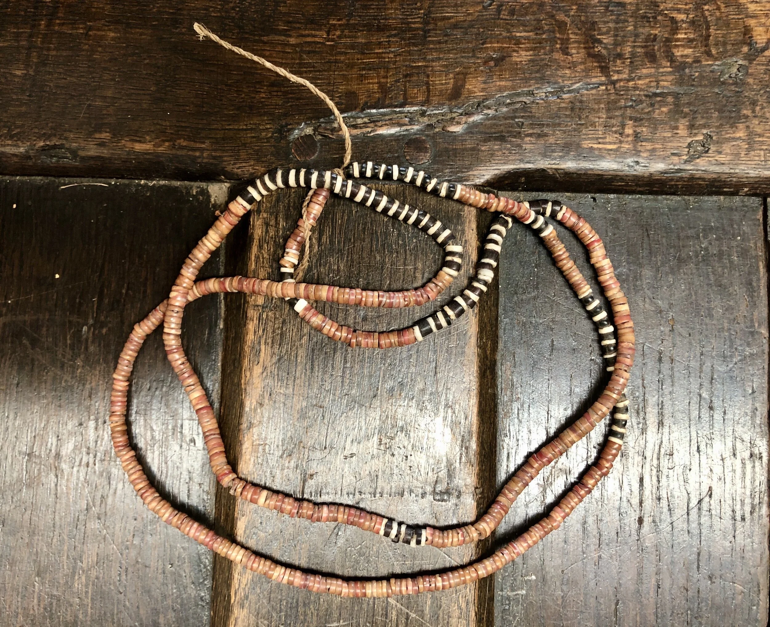 Spondylus and porpoise teeth plus one coconut shell bead on old cotton cord SOLD